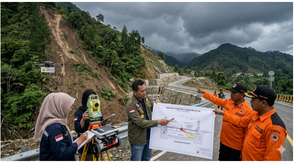 Dokumentasi teknis ini menunjukkan kolaborasi antara pakar geologi dari Universitas Syiah Kuala (UNSYIAH) dan tim BPBD Aceh Tengah di lokasi salah satu titik longsor terparah di jalur Bintang – Simpang Kraft. Di tengah gambar, seorang ahli geoteknik universitas sedang memegang dan menunjuk pada peta stabilitas lereng GIS (yang visualisasinya konsisten dengan data yang ditampilkan pada Gambar 1). Di sekitar mereka, peneliti lain menggunakan handheld sensor structural, total station surveying instrument, drone, dan mencatat data lapangan. Latar belakang gambar menampilkan visualisasi kerusakan nyata pascabencana: sisa-sisa longsor, pohon tumbang, serta sisa-sisa bangunan yang rusak akibat tanah bergeser. Suasana gambar menunjukkan proses analisis teknis yang serius dan berfokus pada data ilmiah.