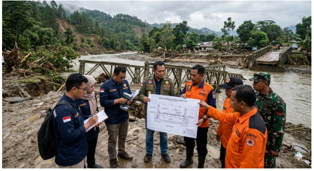 Dokumentasi teknis ini menunjukkan kolaborasi antara pakar mitigasi bencana dari Universitas Syiah Kuala (UNSYIAH MITIGASI) dan tim BPBD Aceh Tengah di lokasi salah satu jembatan darurat Bailey yang ambruk di Gayo. Di tengah gambar, seorang ahli teknik sipil universitas sedang menjelaskan diagram skematik cross-section jembatan yang dicetak besar kepada komandan BPBD, menunjuk langsung pada titik koneksi struktur yang mengalami kegagalan. Di sekitar mereka, peneliti lain menggunakan handheld scanner struktural dan mencatat data, sementara petugas BPBD memberikan konteks kejadian lapangan. Latar belakang gambar menampilkan visualisasi kerusakan nyata pasca-bencana: fragmen jembatan darurat yang terputus, material longsor, serta sisa-sisa bangunan yang rusak akibat banjir bandang dan tanah bergeser. Suasana gambar menunjukkan proses analisis teknis yang serius dan berfokus pada data ilmiah.